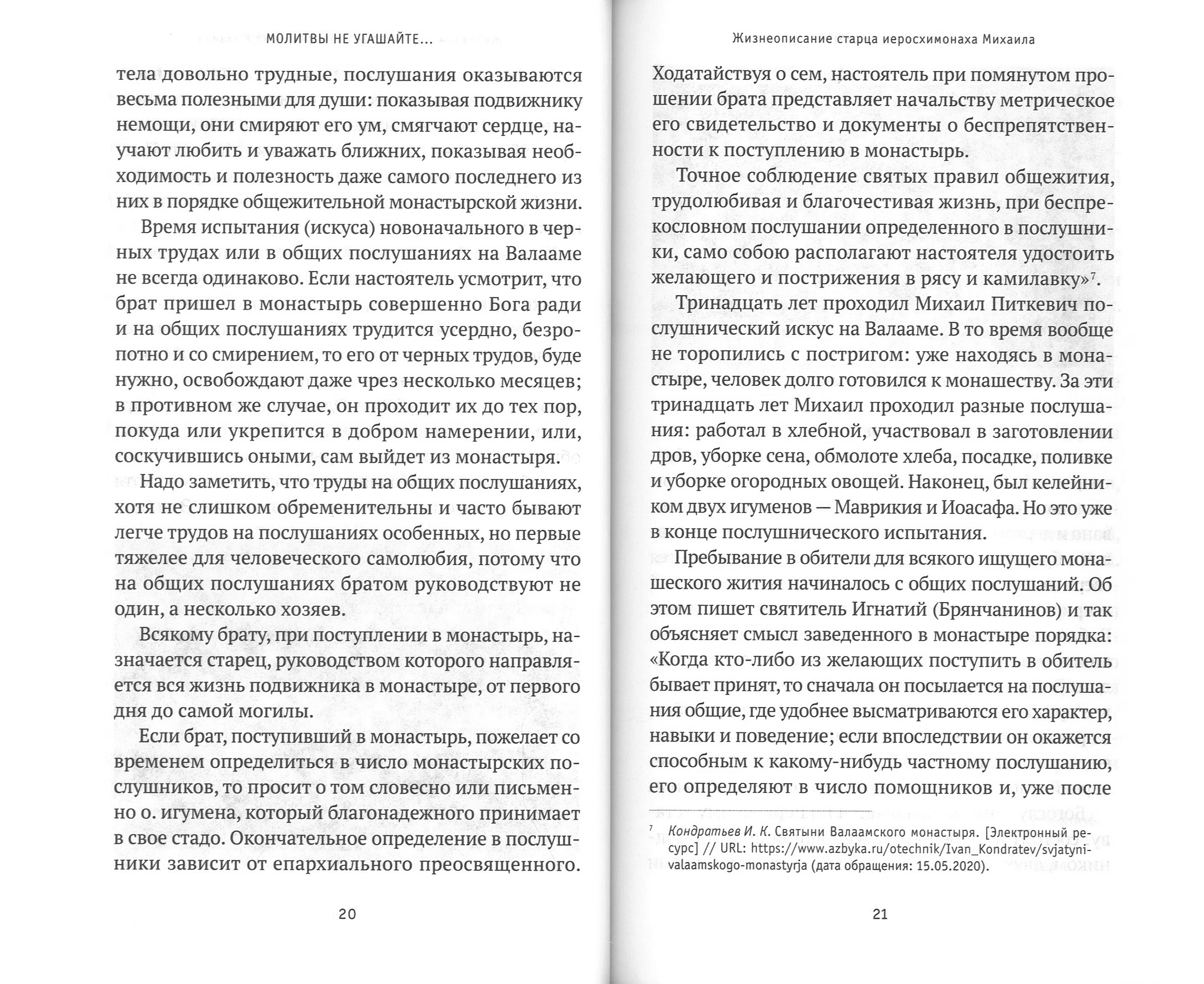 Молитвы не угашайте...Михаил (Питкевич)Тихим и кротким старцем называли схимонаха Михаила (Питкевича). Стал он таким и благодаря личным духовным усилиям, и потому что смиренно воспринял воспитание обстоятельствами жизни, которые послал ему Бог. Раннее сиротство, скитание по России, сложные обстоятельства жизни на Валааме и потом, когда насельникам монастыря пришлось перебраться в Финляндию, — все эти жизненные уроки старец воспринимал как Божие научение. В конце жизни в Псково-Печерском монастыре отец Михаил, много лет потрудившийся на пути «умного делания», стяжания сердечной молитвы Иисусовой, был немногословным наставником молодой братии. Записанные с его слов поучения могут послужить делу духовного просвещения и в наши дни. Рекомендовано к публикации Издательским Советом РПЦ ИС Р23-320-3381. Оглавление I. ЖИЗНЕОПИСАНИЕ СТАРЦА ИЕРОСХИМОНАХА МИХАИЛА |