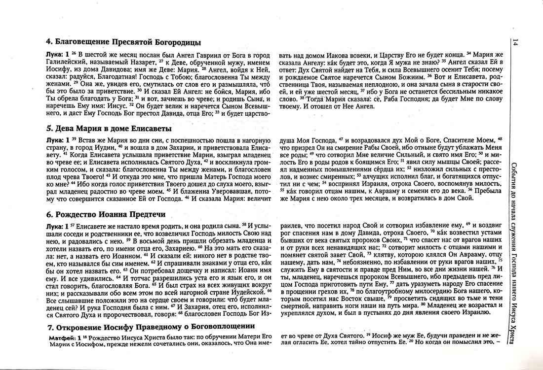 Суть ее в том, что текст Четвероевангелия разделен на фрагменты, которые расставлены в хронологической последовательности, причем тексты разных Евангелистов, описывающих одно событие, например, Преображение Господне, расположены в параллельных столбцах. Такое расположение текста называется Евангельским синопсисом.