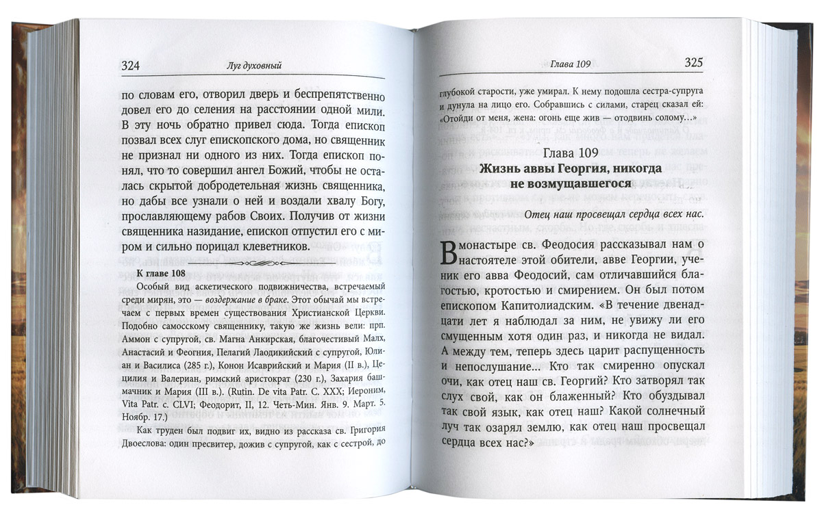 «Луг духовный» принадлежит к числу самых распространенных на Руси агиографических творений. Помимо описания различных событий и промыслительных для спасения случаев, в 219 главах данного творения также даются душеспасительные размышления и наставления подвижников, служащих для назидания каждого православного христианина. Вся книга свидетельствует об истинности Православия и подает поразительные и великолепные примеры любви подвижников ко Христу Богу, жизни по заповедям евангельским.