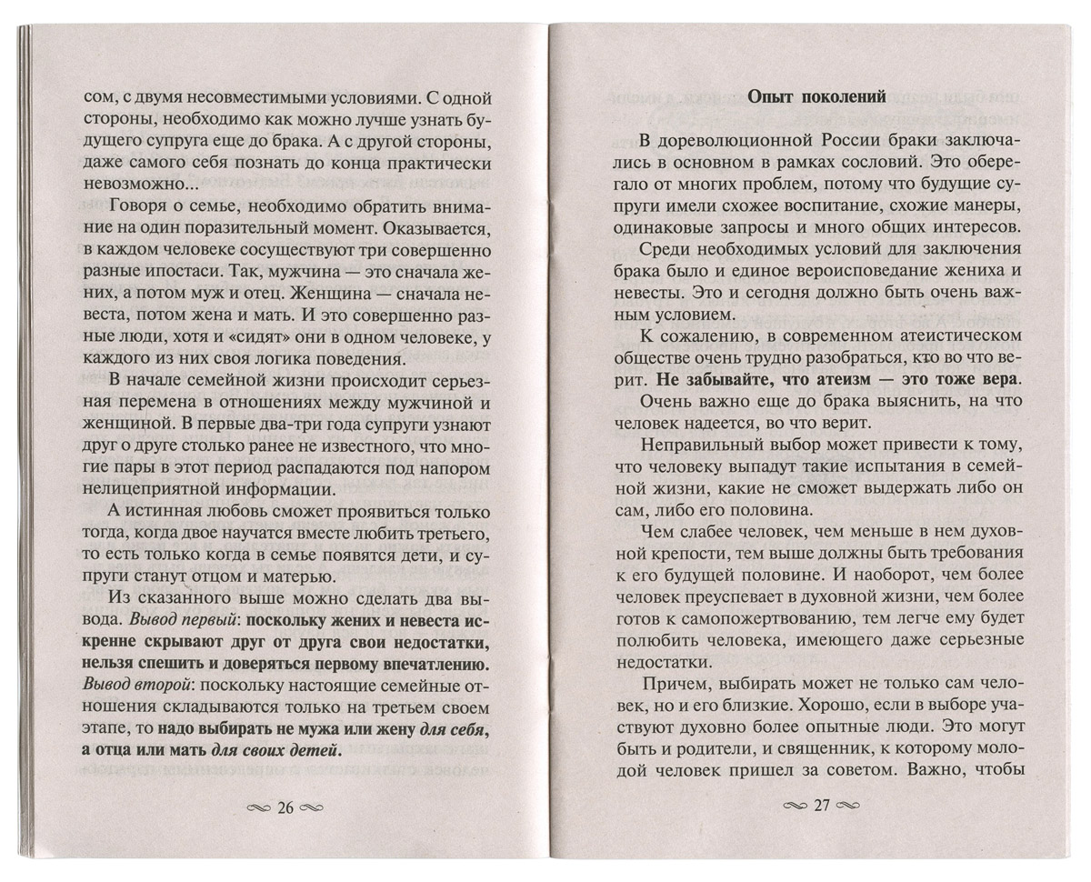 Как стать образцовой женой: О женском счастье и призванииСемья, любовь, брак - являются не временным удовольствием, но долгим и кропотливым трудом. А любящие друг друга люди пронесут его через всю совместную жизнь. Счастье и судьбу близких мы держим в своих руках, о чём в книге расскажут читателю опытные духовники. С любовью и благочестивой верой они раскроют смысл исконного женского призвания - жены и матери. Сложная и многогранная тема взаимоотношений между мужчиной и женщиной, рассмотренная автором, затронет каждого читателя и будет несомненно полезна. Рекомендовано к публикации Издательским Советом РПЦ ИС 13-306-0449. Оглавление Ошибки добрачных отношений – 4 |